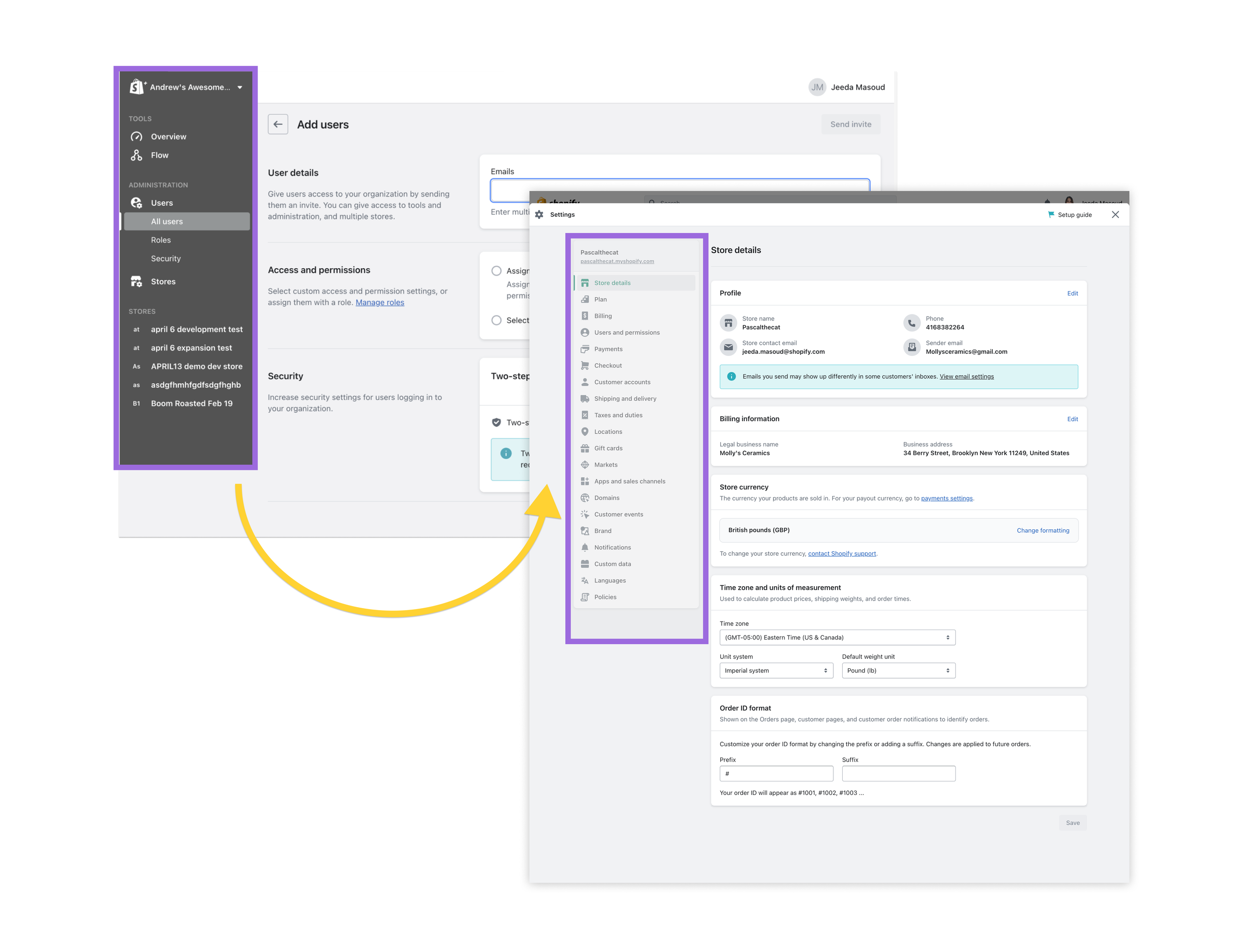 The Shopify admin settings consisted of 3 layers - account, organization, and store. This visual hierarchy was established in order to create guiding principles for where settings features should be built and stored.